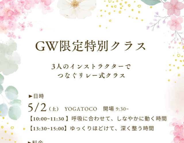 レッスンをしている間は、ほかの誰のためでもない自分だけの時間です。そんな特別なひとときのなかで、ゆっくりと動き、深く、呼吸。次第に感じる心地よさが、笑顔と幸せをもたらし、新たな日々へのトビラを開いてくれるでしょう。