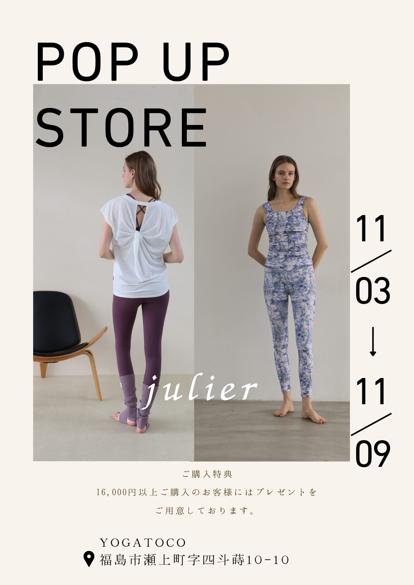 CONTENTS コンテンツ 2025.10.13 『Julie』POP UP STORE ブログ イベントクラス \「Julier」 ポップアップ開催お知らせ/ オリジナルプリントを中心に様々なシーンに調和する機能性と洗練されてデザインの「Julierジュリエ」は、ファッションデザイナーによって生み出されたウエアです ヨガやワークアウトと日常をつなぐウエアを、この機会にぜひ手にとってご覧ください 11/3(月祝)〜11/9(日) 時間:レッスン時間以外とさせていただきます。スケジュール等ご不明な場合は、お問合せください。 購入者にはノベルティプレゼント🎁(プレゼントには条件があります 一覧へ戻る