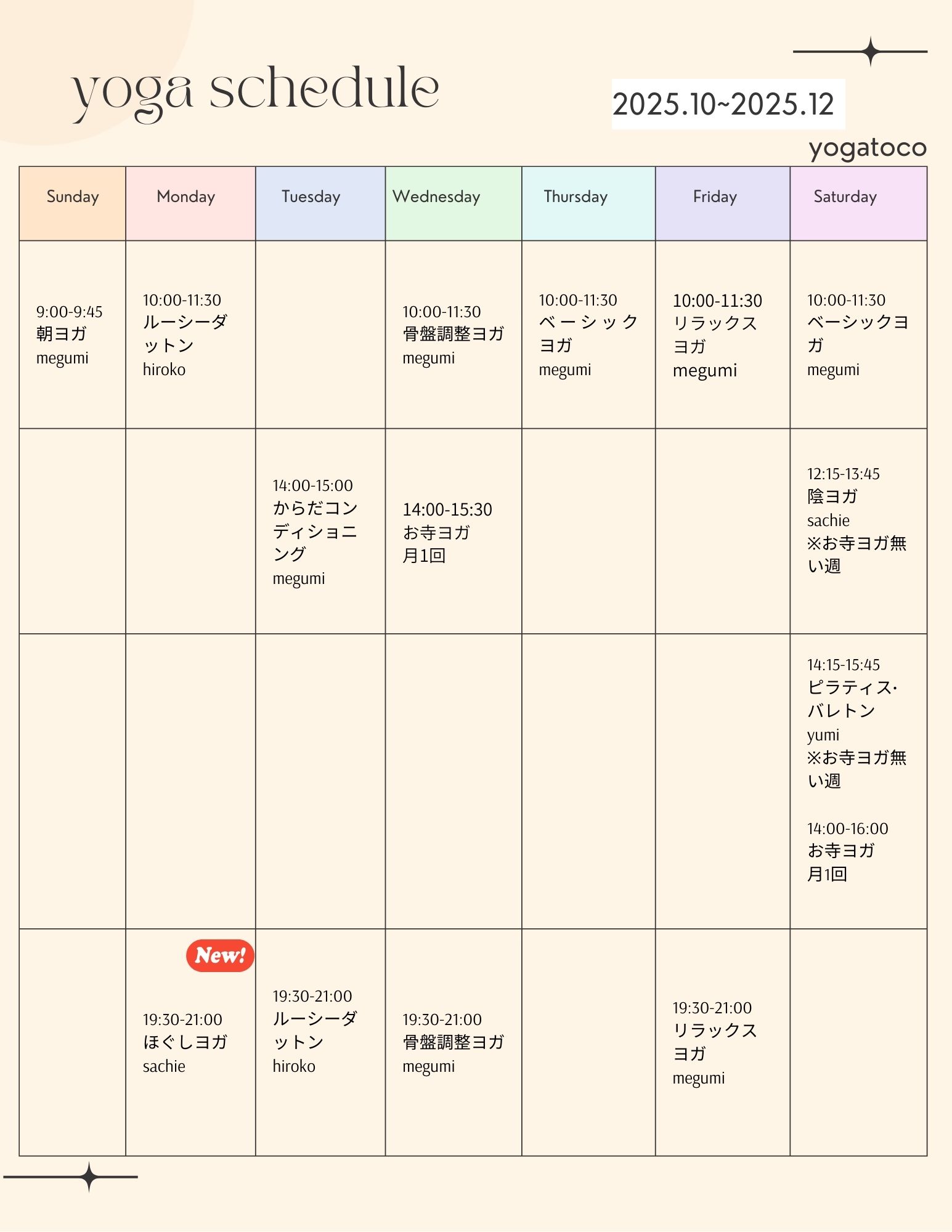 CONTENTS コンテンツ 2025.09.20 2025,10月〜12月 SCHEDULE スケジュール 年度スケジュール 通常、半年分の予定でお知らせしておりますが、インストラクターの都合により、2025年12月までのスケジュール予定とさせていただきます。2026年1月からのスケジュールは、改めてお知らせ致します 一覧へ戻る