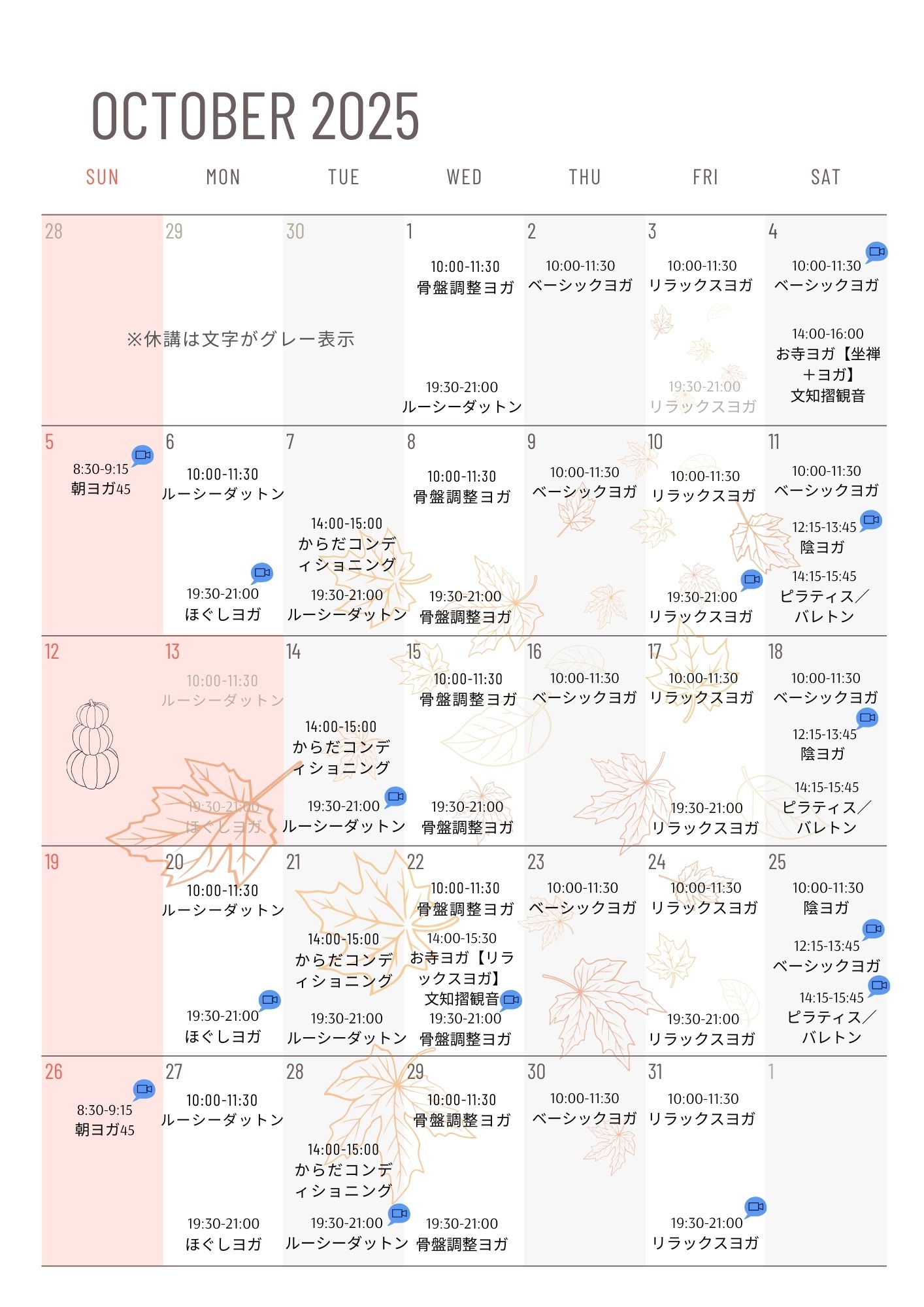 CONTENTS コンテンツ 2025.09.25 SCHEDULE 10月 スケジュール 月スケジュール 毎月、翌月の予約受付開始は、前月末日から予約可能となります。例)10月クラス予約は9月30日から可能それまでは予約ができませんので、ご注意ください。1度の予約は最大5回まで。 時間変更、休講代行クラスあります。尚、休講・変更詳細はホームページでも確認できます。 一覧へ戻る