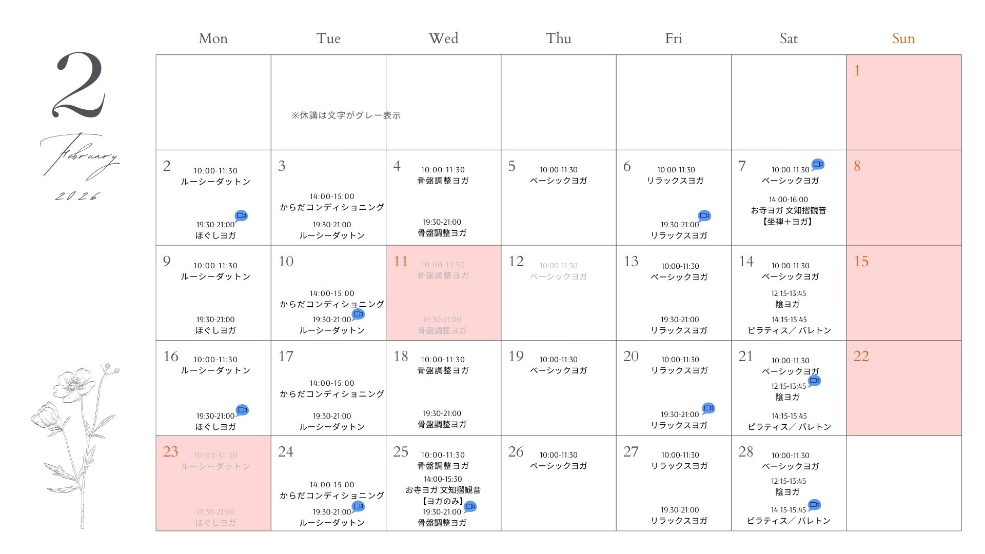 CONTENTS コンテンツ 2026.01.27 SCHEDULE 2月 スケジュール 月スケジュール 2月の予約受付開始は1月31日から予約可能となります。時間変更、休講代行クラスあります。尚、休講・変更詳細はホームページでも確認できます。 一覧へ戻る