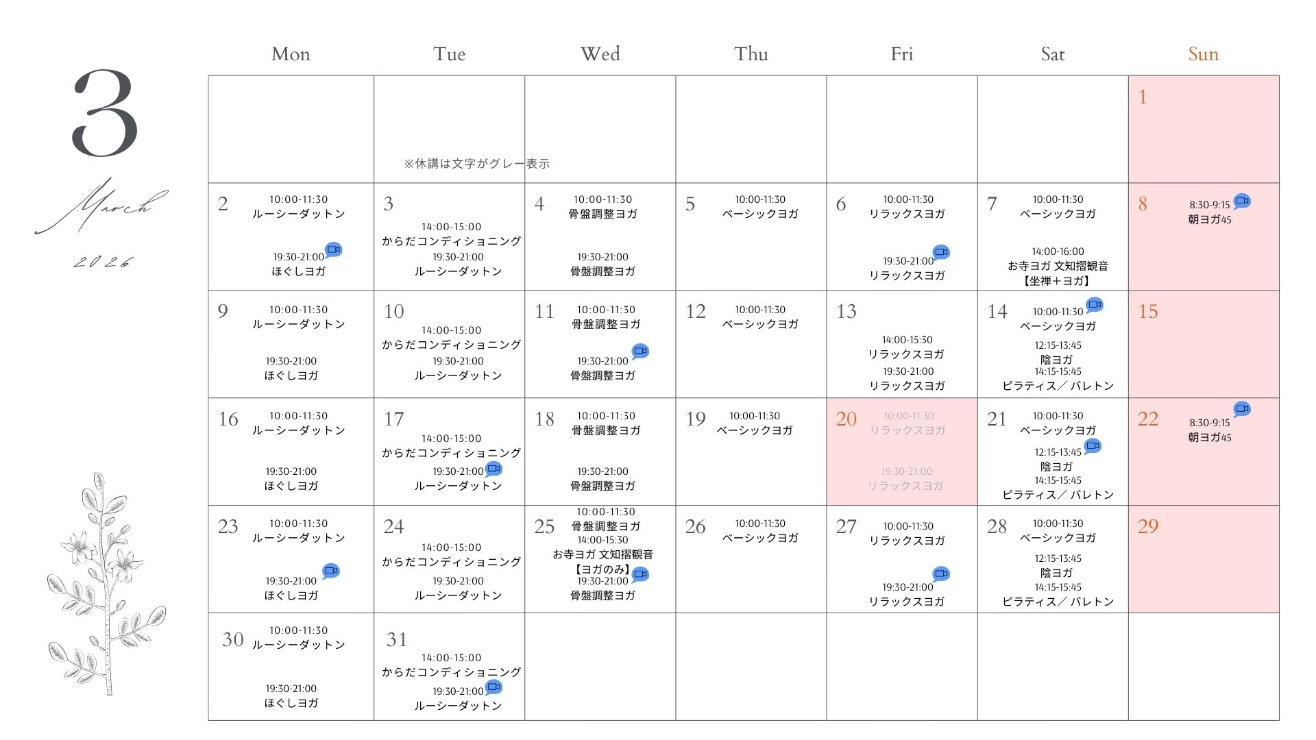 CONTENTS コンテンツ 2026.02.28 SCHEDULE 3月 スケジュール 月スケジュール 3月の予約受付開始は3月1日から予約可能となります。時間変更、休講代行クラスあります。尚、休講・変更詳細はホームページでも確認できます。 一覧へ戻る